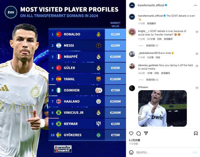 JRS直播网讯德转发布2024年度德转全平台球员资料页浏览量排行,C罗力压梅西登顶。德转配文:“GOAT之争结束了!”
