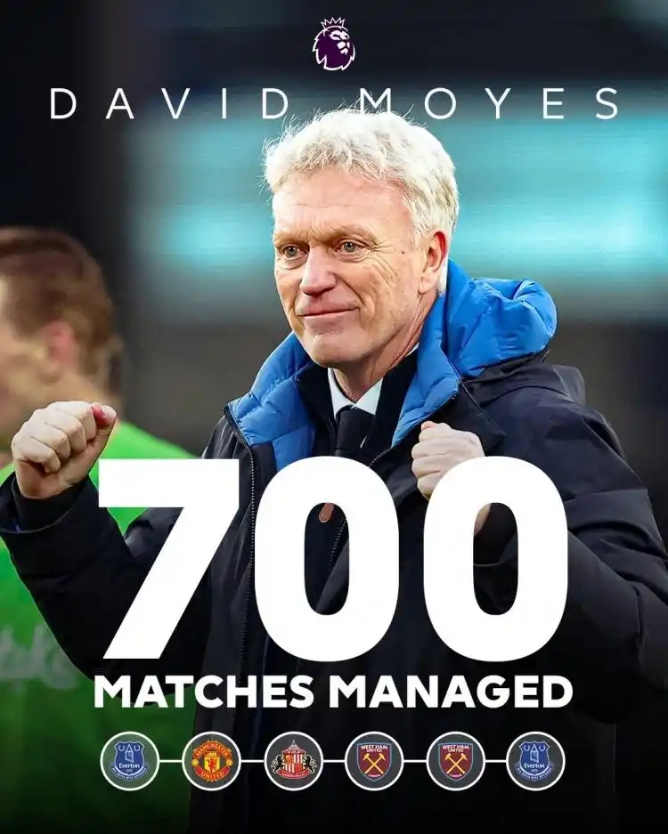 JRS直播网讯 根据英超官方统计,莫耶斯今天迎来执教生涯的第700场英超。