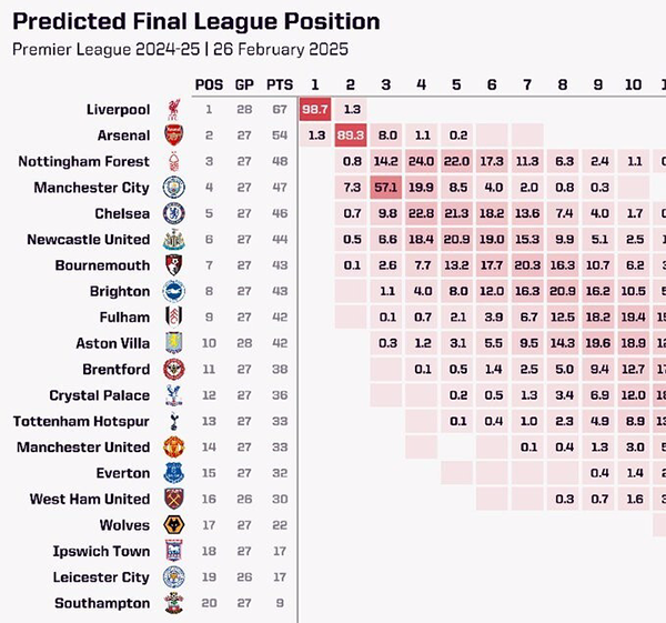 JRS直播网讯北京时间2月27日,英超第27轮展开多场角逐,在两场关乎争冠的对决中,领头羊利物浦坐镇2-0力挫纽卡斯尔,而阿森纳则在客场0-0被诺丁汉森林逼平。如此一来,利物浦在积分榜的领先优势,已经扩大至13分。
