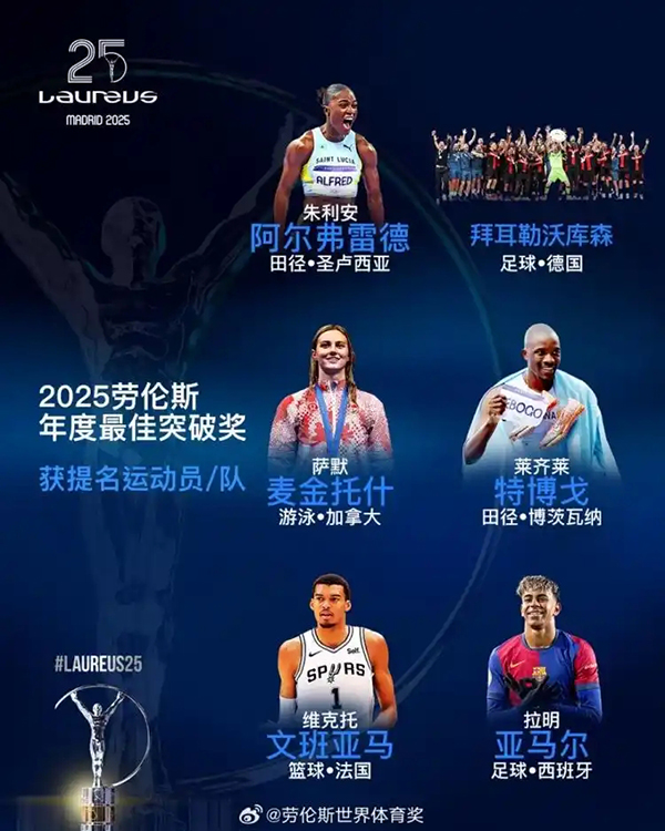 2025劳伦斯年度最佳突破奖提名名单: