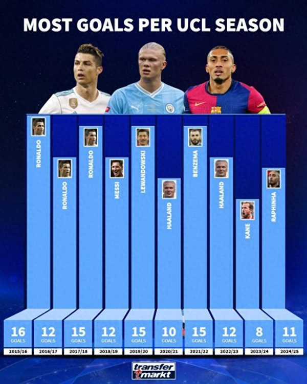 JRS直播网讯德转盘点了近10年欧冠单赛季最多进球纪录,具体如下: