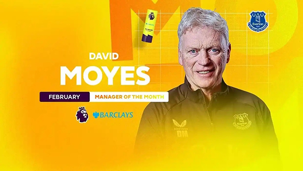 JRS直播网讯英超官方宣布,埃弗顿主帅莫耶斯当选2月份最佳主帅。