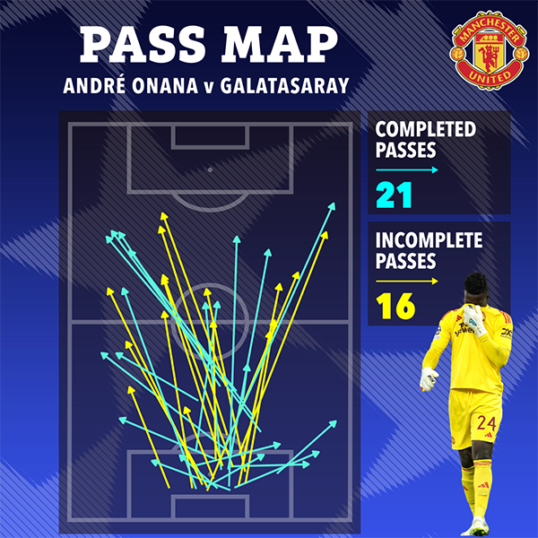 27岁的奥纳纳因为其出色的脚下能力被引进取代德赫亚,但糟糕的数据表明,他不仅在扑救方面比不上32岁的西班牙门神,而且脚下传球也屡有失误,对加拉塔萨雷的欧冠小组赛中,甚至面对面传给对手,导致卡塞米罗被罚下。