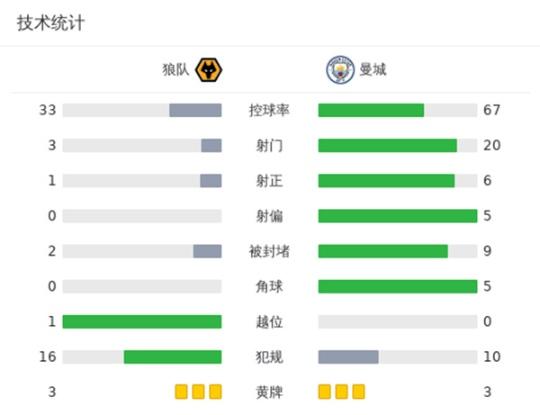 最终曼城客场1-2狼队联赛首败。