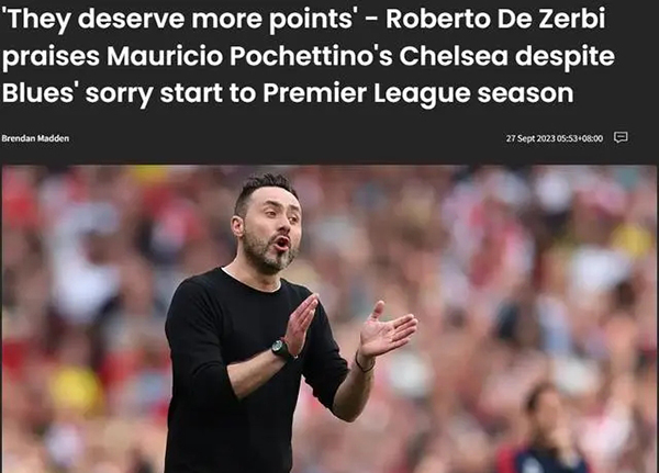 JRS直播网09月27日讯 布莱顿主教练罗伯托-德泽比称赞了波切蒂诺的切尔西队,尽管蓝军本赛季开局不利。