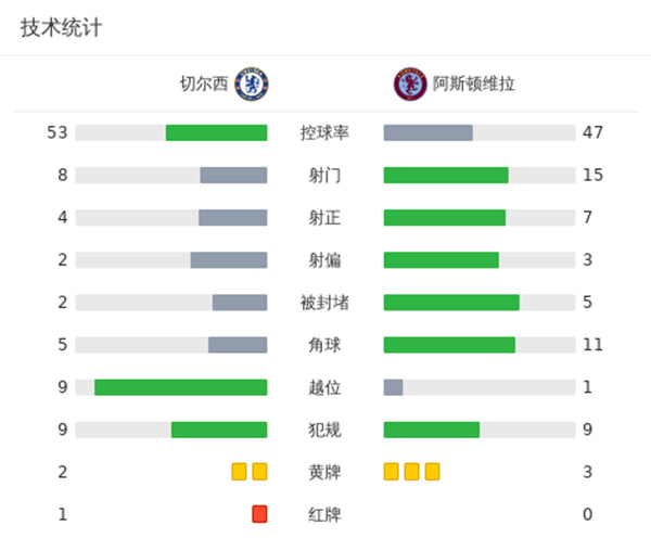 全场比赛结束,切尔西0-1阿斯顿维拉。