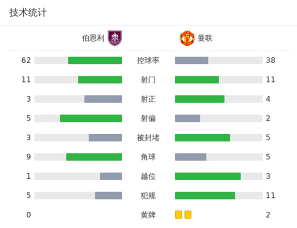关键事件: 第45分钟,曼联率先打破僵局,埃文斯后场精准长传,B费禁区内不停球直接起右脚凌空爆射破门得分,曼联1-0伯恩利!
