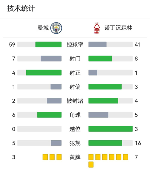 全场比赛结束,曼城2-0击败诺丁汉森林。