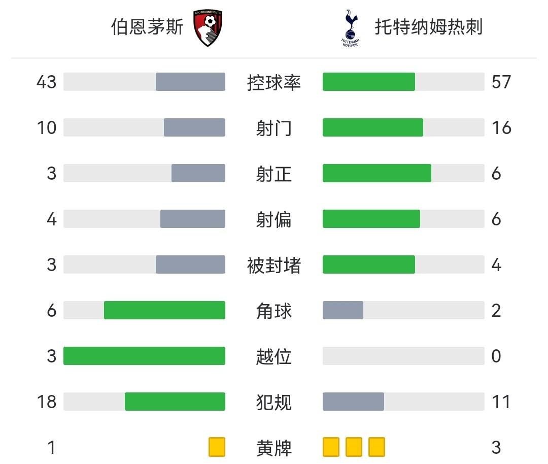 全场比赛结束,热刺客场2-0击败伯恩茅斯。