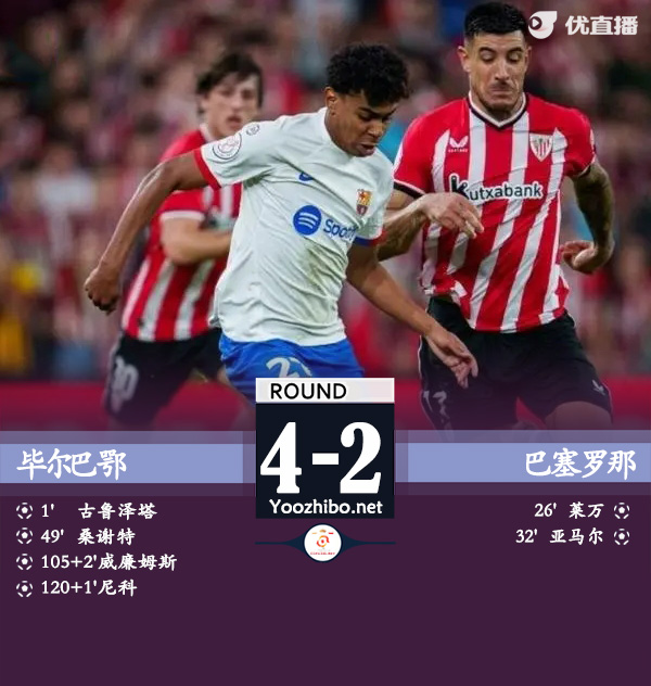 JRS直播网讯 1月25日讯 国王杯1/4决赛,巴萨对阵毕尔巴鄂。上半场开场仅38秒,巴萨后防解围失误,古鲁泽塔闪击破门,莱万同样也是利用毕巴解围失误扳平比分,亚马尔一条龙内切远射反超比分。易边再战桑塞特头槌破门扳平,亚马尔两次错失单刀。常规时间巴萨2-2毕巴进入加时赛。加时赛上半场补时,伊纳基关键破门,下半场补时,尼科锁定胜局。最终巴萨加时鏖战2-4不敌毕巴止步八强。