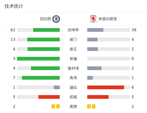 最终全场比赛结束,切尔西6-1米德尔斯堡。