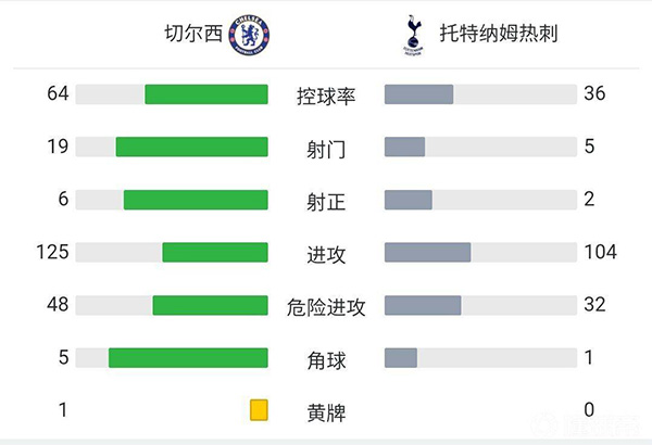 第5分钟,切尔西进球!热刺后场坦甘加出球失误被阿隆索上抢成功随后给到禁区前插的哈弗茨后者小角度推射打到桑切斯脚上折射入网。切尔西取得梦幻开局。切尔西1-0热刺。
