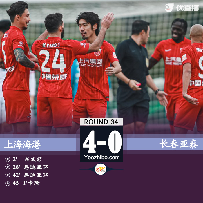 JRS直播网12月31日讯 北京时间12月31日15:00,中超联赛第34轮上海海港迎战长春亚泰的比赛,上半场吕文君闪击,恩迪亚耶双响,卡隆中超首球,下半场双方均无建树,最终海港4-0大胜亚泰。