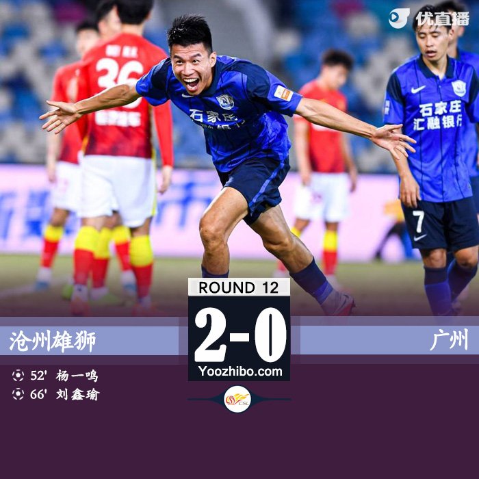 JRS直播网讯北京时间8月7日晚上20:00,中超联赛第11轮,广州对阵沧州雄狮。上半场,双方均未创造得分良机。半场战罢,沧州雄狮暂0-0广州。下半场,杨一鸣凌空扫射破门,韦世豪中框,刘鑫瑜进球。全场结束,沧州雄狮2-0广州。