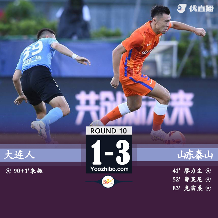JRS直播网 7月10日讯 北京时间7月10日晚上18:30,中超联赛第10轮,山东泰山对阵大连人。上半场,孙准浩伤退廖力生替补,闫相闯爆射中柱,廖力生世界波破门。半场战罢,山东泰山暂1-0大连人。下半场费莱尼破门,克雷桑锁定胜局,朱挺补时扳回一球。全场结束,山东泰山3-1大连人。