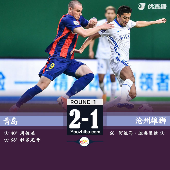 JRS直播网4月21日讯 北京时间4月21日18:00,中超联赛第一阶段第1轮,青岛对阵沧州雄狮。上半场,周俊辰抽射破门,穆里奇包抄打飞失良机。下半场,迪奥曼德扳平比分,拉多尼奇世界波破门再次超出,此后双方未能改写比分。全场比赛结束,青岛2-1战胜沧州,取得新赛季开门红。