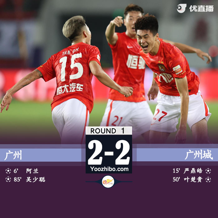 JRS直播网4月20日讯 北京时间4月20日20:00,新赛季中超首轮一场焦点战在广州队和广州城之间进行。上半场阿兰打入新赛季首球,黄政宇制造严鼎皓乌龙,韩佳奇扑出艾克森点球。下半场吉列尔梅助攻叶楚贵反超,吴少聪替补扳平比分。最终广州队2-2战平广州城。