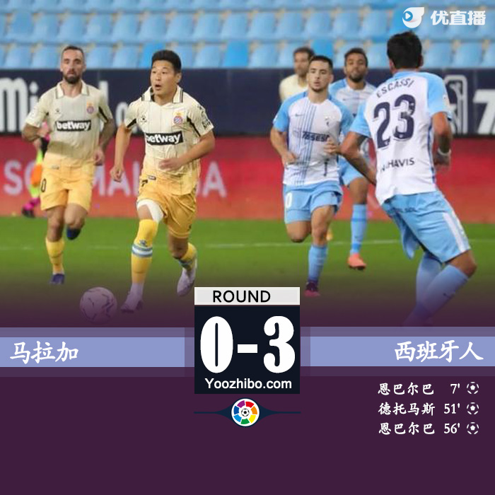 全场比赛结束,西班牙人客场3-0战胜马拉加。