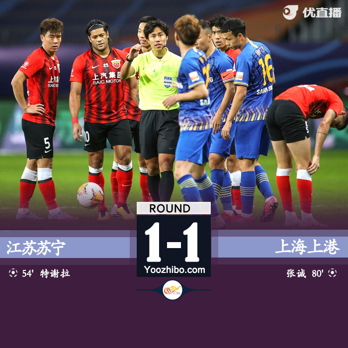 JRS直播网讯:北京时间10月29日晚19点35分,2020年中超联赛第二阶段第三轮(总第17轮)争冠组江苏苏宁和上海上港的比赛,在苏州奥林匹克中心开始。上半场江苏苏宁制造更多威胁场面,但没有进球。下半场第54分钟埃德尔右路送出精准直塞球,特谢拉反越位得手,禁区内挑射得分。第68分钟买提江铲球踢在张诚脚腕下,结果吃到红牌被罚下。第81分钟奥斯卡外围送球,王燊超拿球在禁区右侧传中,吕文君倒地卧射打疵,但球弹起砸在张诚脸上反弹进门。最终两队1比1踢平。