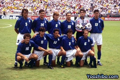 图为参加决赛意大利队的首发阵容。图中下排右一为队长巴雷西,中间为巴乔,上排左一为马尔蒂尼。
