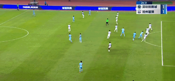 第45+7分钟,张煜东挑传,张卫插上垫射破门反超比分,新鹏城2-1沧州