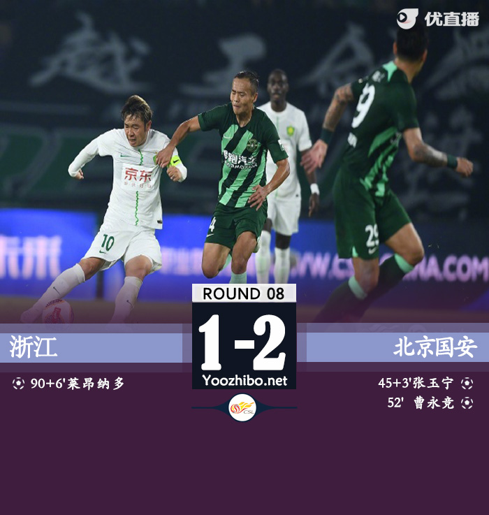 JRS直播网讯:北京时间4月26日19点35分,中超第8轮浙江主场迎战北京国安。上半场浙江攻势占优,奥苏乌射中立柱,补时阶段张玉宁破门,下半场,曹永竞扩大优势,莱昂纳多造点但自己主罚的点球被侯森扑出,随后他在补时阶段扳回一球。全场比赛结束,北京国安2-1浙江。