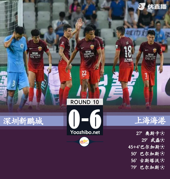 JRS直播网讯:北京时间5月5日晚上20:00,中超第10轮,上海海港客场挑战深圳新鹏城。上半场,王浩开场8分钟放倒武磊吃到直红,李智送点奥斯卡笑纳,茹萨先后助攻武磊和巴尔加斯破门。下半场,巴尔加斯梅开二度,奥斯卡助攻古斯塔沃破门,奥斯卡造点巴尔加斯戴帽。全场结束,上海海港6-0深圳新鹏城。本场过后,上海海港6胜3平积21分排名第二,近两轮进11球失0球状态大火;深圳新鹏城2胜3平5负积8分,排名第12位。