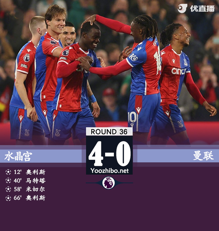 JRS直播网讯:北京时间5月7日,2023-24赛季英超联赛第36轮,曼联客战水晶宫。上半场奥利斯进球,卡塞米罗头球破门,但因霍伊伦冲撞门将被判无效,随后马特塔为水晶宫再下一城,上半场曼联暂0-2水晶宫;下半场卡塞米罗破门但越位在先,米切尔破门,奥利斯再进一球,最终水晶宫4-0曼联,红魔近6轮比赛只赢1场。