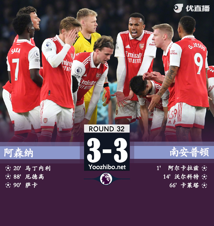 JRS直播网讯 北京时间4月22日03:00,英超联赛第32轮阿森纳迎战南安普顿的比赛,上半场拉姆斯代尔开场送礼阿尔卡拉斯抽射破门,随后沃尔科特推射建功,马丁内利凌空爆射扳回一城,半场结束,阿森纳1-2南安普顿。下半场卡尔头球扩大比分,厄德高远射破门,萨卡补射扳平。最终,阿森纳3-3南安普顿三轮不胜。