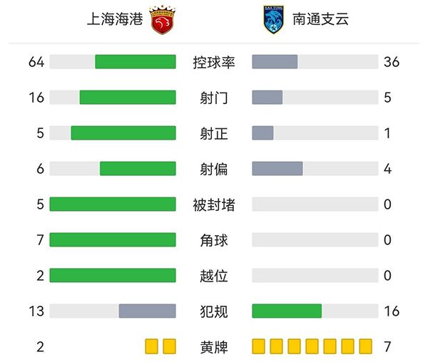 全场比赛结束,最终上海海港2-1逆转南通支云,继续领跑积分榜。