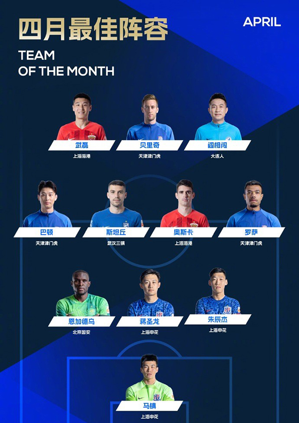 JRS直播网讯 北京时间5月10日,中超联赛官方发布4月份最佳阵容,武磊领衔,最佳球员阎相闯、最佳门将马镇入选。
