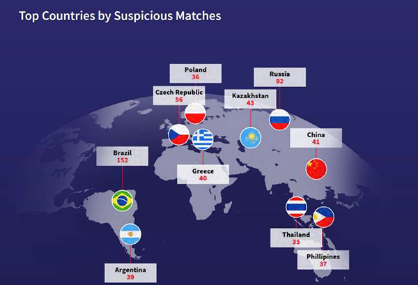 其中,中国范围有41场体育比赛被列为“可疑比赛”,巴西152场,阿根廷39场,希腊40场,捷克56场,波兰36场,俄罗斯92场。
