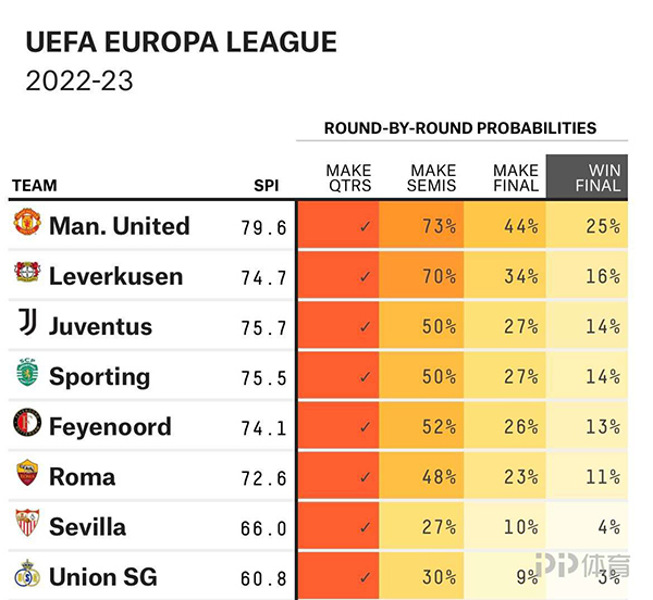 JRS直播网03月18日讯 欧联杯1/4决赛抽签结果出炉,FiveThirtyEight数据统计各队夺冠概率如下。