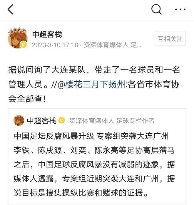 球队这边忙碌的热火朝天,不过一条意外的消息也打乱了平静,根据足球专栏记者“中超客栈”的报道,调查组突击调查了大连某俱乐部,并且带走了一名球员和1名球队管理层。虽然中超客栈并没有点名是大连的哪一支俱乐部,但是这个差点没有曝出身份证的说法已经很明确了。