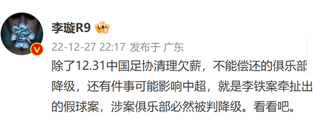 除此之外,与李铁有牵连的俱乐部,也将被判降级,波及面也会非常广。此前就有媒体人爆料,李铁在执教河北时,曾和天津权健以及南方某保级队踢过默契球,也已经有人找到了当时的录像视频,可以说证据确凿。而作为中国足球的名宿,李铁在中超的朋友很多,牵连的俱乐部也势必不止这两家。