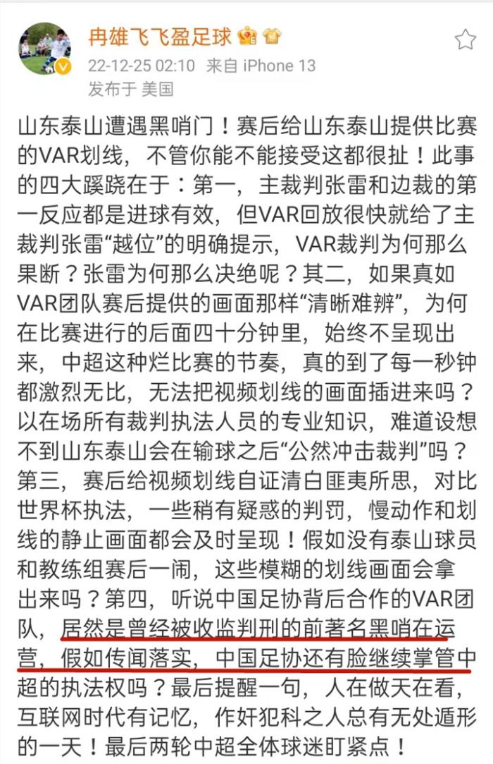 当然,在冉雄飞的这一次爆料中,最重要的重点在于第四点,冉雄飞爆料:听说中国足协背后合作的VAR团队竟然是曾经被收监判刑的前著名黑哨在运营。