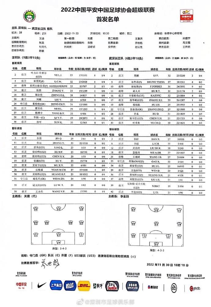 并配图今晚19:30,深圳队与武汉长江队首发名单。