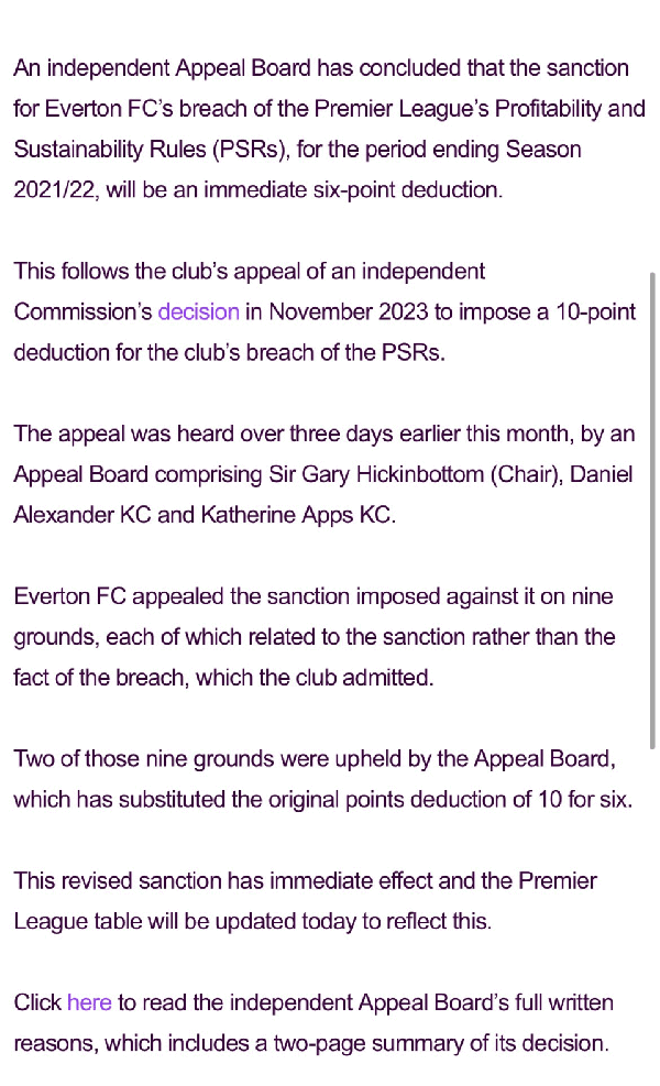 在被扣除10分处罚后,埃弗顿不服,称这一决定“完全不成比例和不公正”,并在两周后提出上诉。最终英超在3个月后选择将埃弗顿的处罚,从扣10分降为扣6分。而对于这一结果,埃弗顿也感到满意。
