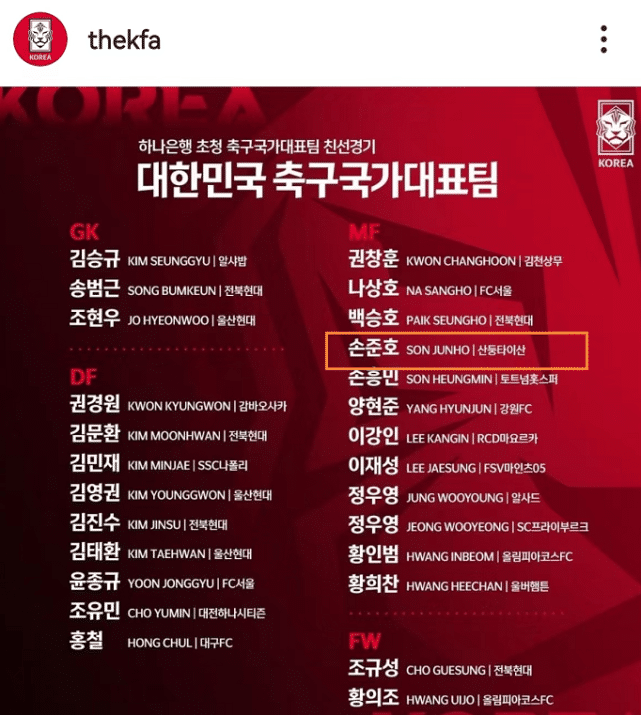 JRS直播网09月13日消息,韩国足协公布最新一期国家队集训名单,山东泰山队外援孙准浩入选。本次韩国集训是为世界杯确定参赛名单,这也是孙准浩竞争世界杯参赛资格的最好机会。按照安排,韩国本次集训的时间是9月19日到27日,期间会进行两场热身赛。