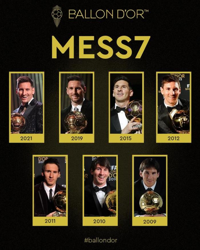 金球奖官方推特晒出了梅西和7座金球的合影,配文Mess7,把最后一个字母i巧妙地换成了7。
