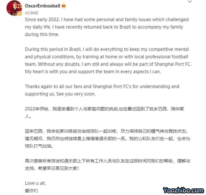 北京时间8月3日,中超头牌巨星奥斯卡本人发布官宣声明,他在社交平台直接宣布自己的决定,表示自己在2022年遇到了个人和家庭的问题挑战,近期回到巴西陪伴家人,在巴西会在家训练或者跟随当地俱乐部一起训练保持状态。在这样的离队状态下,奥斯卡声明自己还是上海海港的一员,直言自己会心系上海海港,继续为球队和队友们加油打气,最后他还不忘感谢上海海港俱乐部的支持和理解。