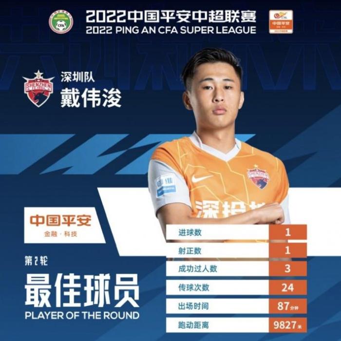 JRS直播网06月11日讯 刚刚,中超联赛官方宣布,深圳队球员戴伟浚当选为中超第2轮MVP。