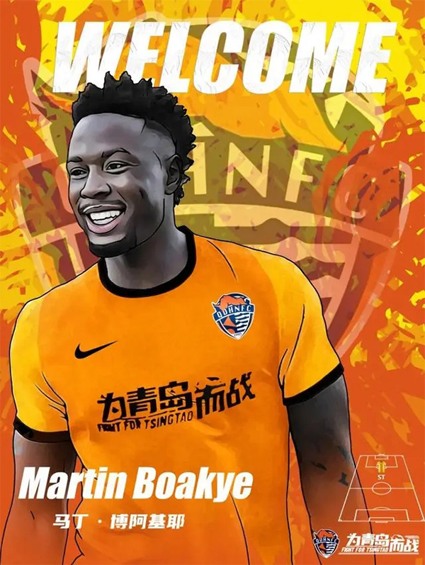 经与球员协商达成一致,意大利籍前锋马丁·博阿基耶(Martin Boakye)正式加盟青岛海牛足球俱乐部。