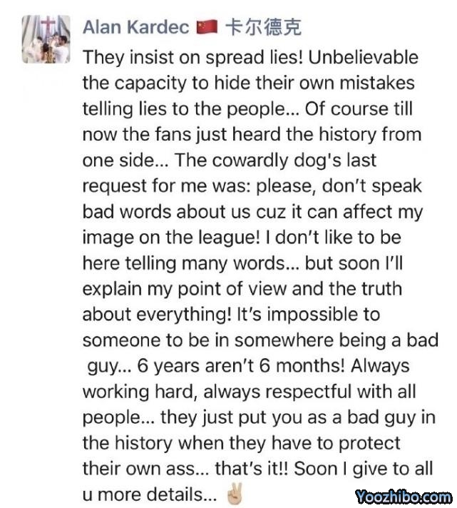 卡尔德克在文中直言自己的中超老东家一直在向球迷掩盖事情的真相。他甚至还怒斥某人是狗;“那条怯懦的狗对我提出的最后请求是:请求你不要说我们的坏话,因为这会影响我(指那条怯懦的狗)在联赛的个人形象!”