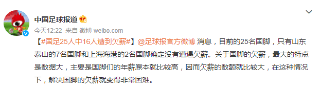 JRS直播网04月06日讯 《足球报》消息,目前国足25名球员中,只有山东泰山7名球员和上海海港两名球员未遭遇欠薪。