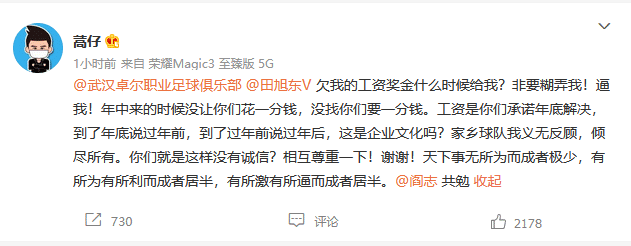 JRS直播网02月16日讯 中午,34岁的国足队长之一蒿俊闵公开直接发飙,与家乡球队武汉队撕破脸,原因是武汉队没有按时支付蒿俊闵的工资。值得一提的是,武汉队去年也是在开年出现了欠薪传闻,周通、刘毅等人在网上公开向武汉队讨薪和讨要奖金,不过当时武汉队公开回应没有欠薪迹象。这一次国足队长也是中超名将蒿俊闵的发声则掷地有声,让武汉队难以回应。