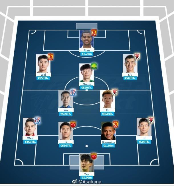 中超国内球员最贵阵容(4-2-3-1)如下:
