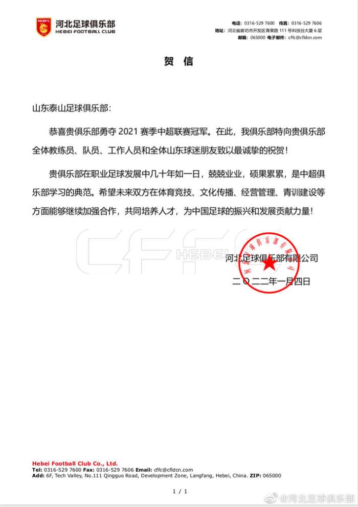 恭喜贵俱乐部勇夺2021赛季中超联赛冠军。在此,我俱乐部特向贵俱乐部全体教练员、队员、工作人员和全体山东球迷致以最诚挚的祝贺!