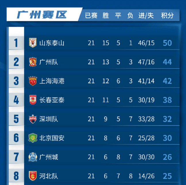 广州队的年轻人发挥不错,凌杰和谭凯元连续进球,他们2比0击败长春亚泰,排名第2位。现在亚泰已经锁定第4名,确定出战亚冠附加赛,广州队和海港最后一轮对决,两队也将争夺亚军,广州队只要不败就可以拿到第2,海港只有赢球一条路。首回合两队打平,如今全华班的广州队依然不逊色双外援的海港。此外,深圳和国安对决,深圳只要不输球就可以拿到第5,广州队和河北队争夺第7位,两队的积分差距只有1分。