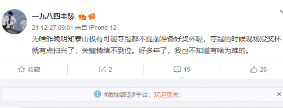 知名记者丰臻就在社交媒体上表示:为啥昨晚明知泰山极有可能夺冠都不提前准备好奖杯呢,夺冠的时候现场没奖杯就有点扫兴了,关键情绪不到位。好多年了,我也不知道有啥为难的。
